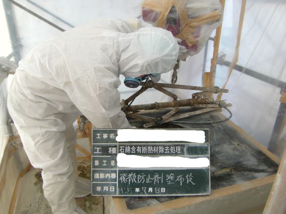 | 石綿の顕微鏡写真 | 折半吹付石綿材 | 石綿除去の様子 |